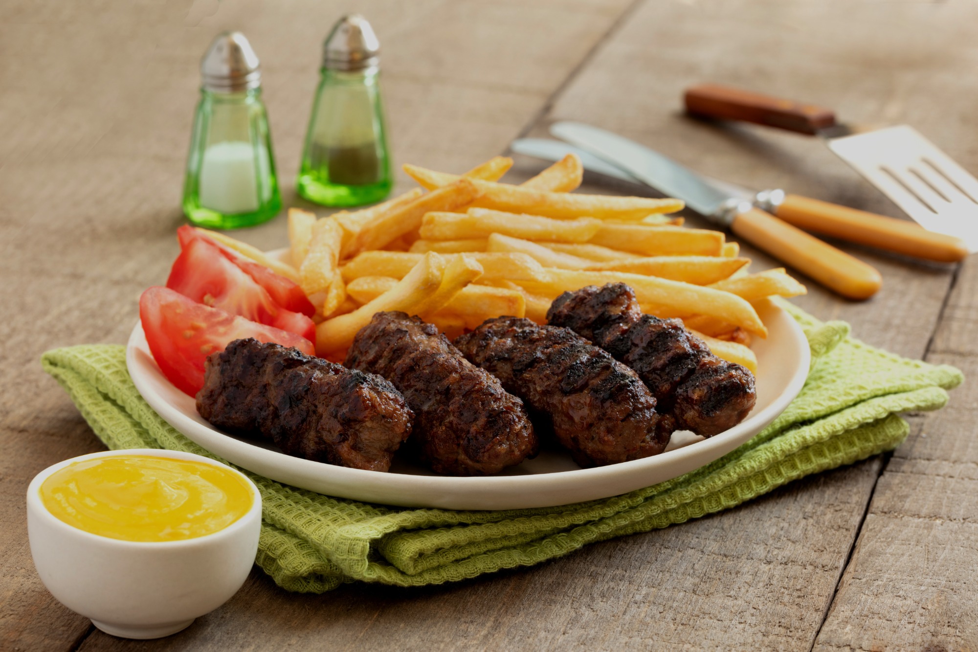 hu - Mici 4 db (200g) kenyér, mustár és sült krumpli(140g) caserolă -